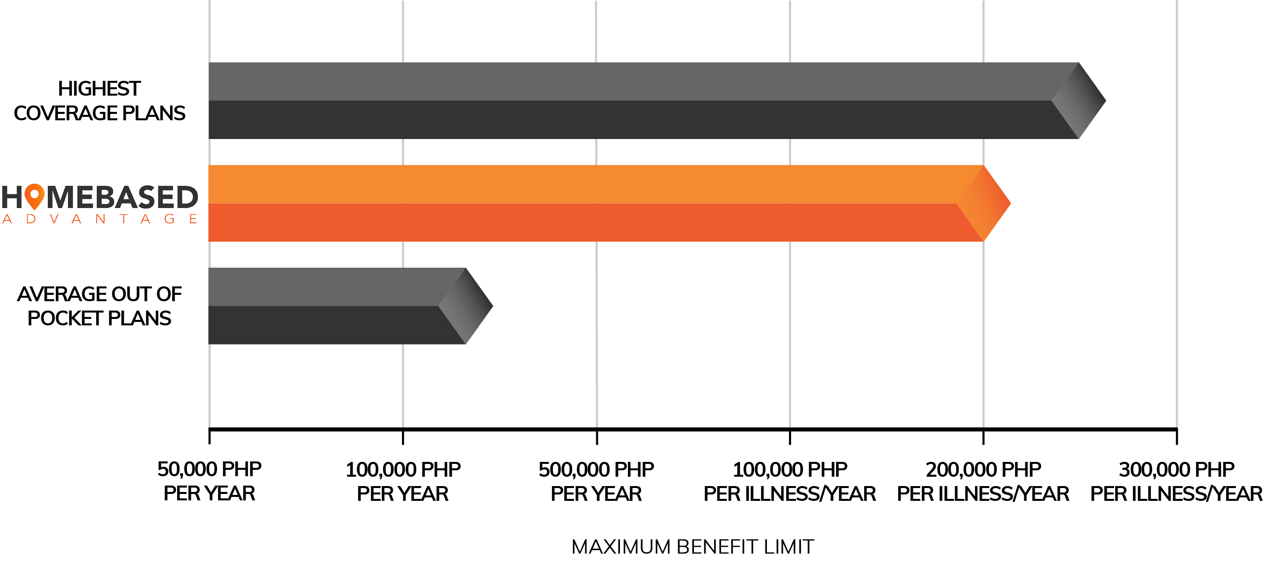 At Homebased Advantage, we prioritize the essential features of Filipino insurance, one of which is the Out of Pocket Maximum. We differentiate ourselves from other providers by offering a significantly higher allowance of 200,000 PHP per illness, per year. This sets us apart in the market and positions us as a leader in providing top-notch insurance options for Filipinos.